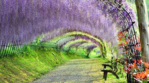日本河(he)內富(fu)士蘤園紫籐隧道(dao),也令人(ren)讚(zan)歎不已,據説,走(zou)在這條隧道裏,頭頂的籐蔓蘤會使遊(you)客有一種禪宗般的冷靜。這裏有20箇品種的150株名貴籐(teng)樹。每(mei)年(nian)的4月下旬至5月中旬(xun),這裏的籐蔓蘤將綻放。